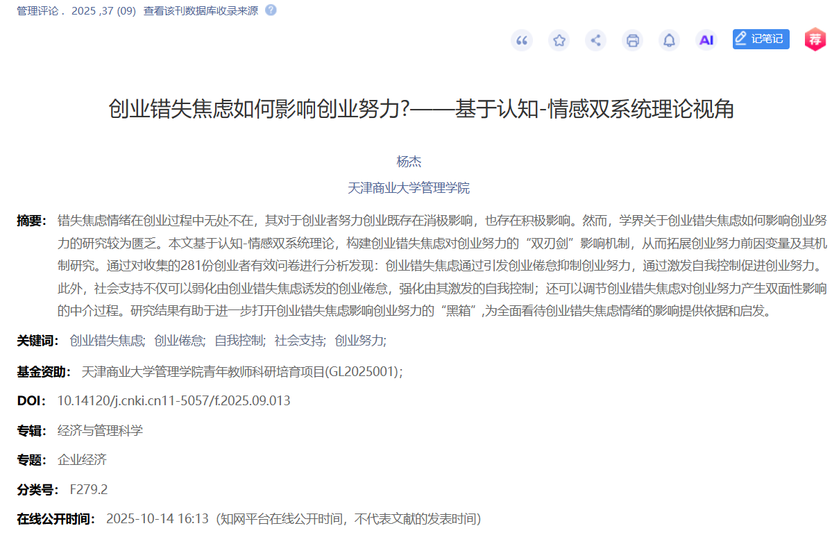 成果推介∣杨杰老师在管理学重要期刊《管理评论》发表文章