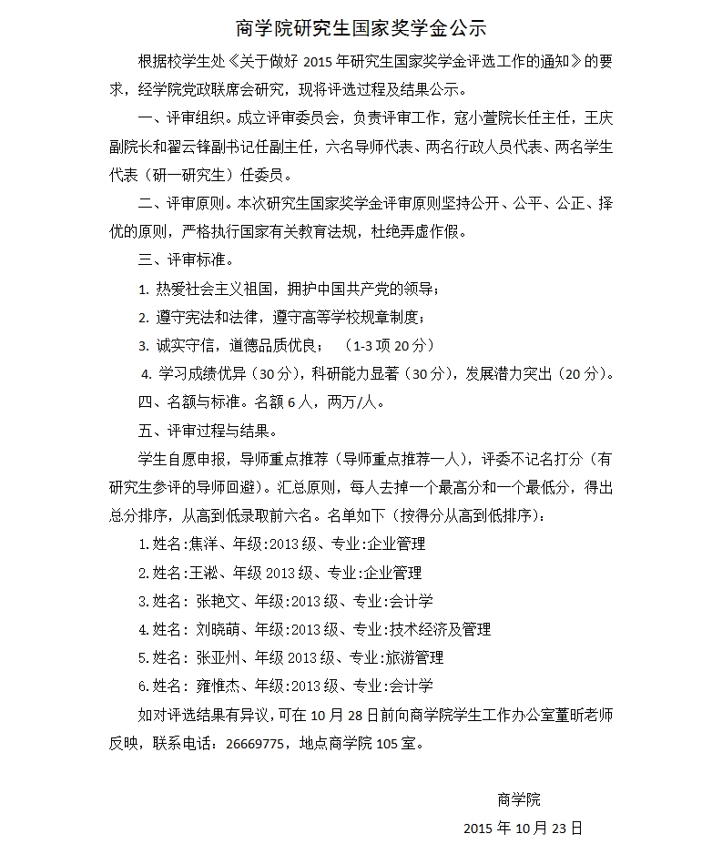 商学院2014-2015学年天津市人民政府奖学金评选工作安排