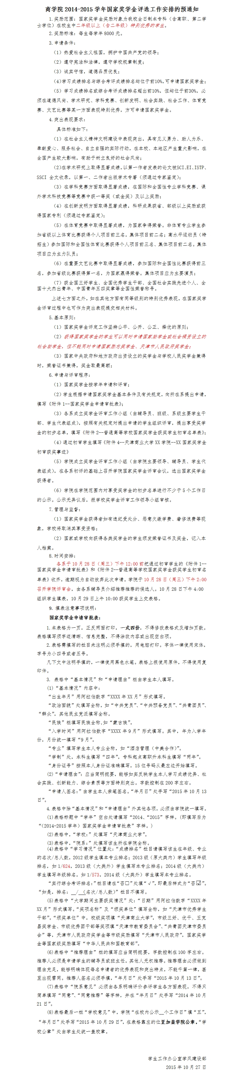 商学院2014-2015学年国家奖学金评选工作安排的预通知