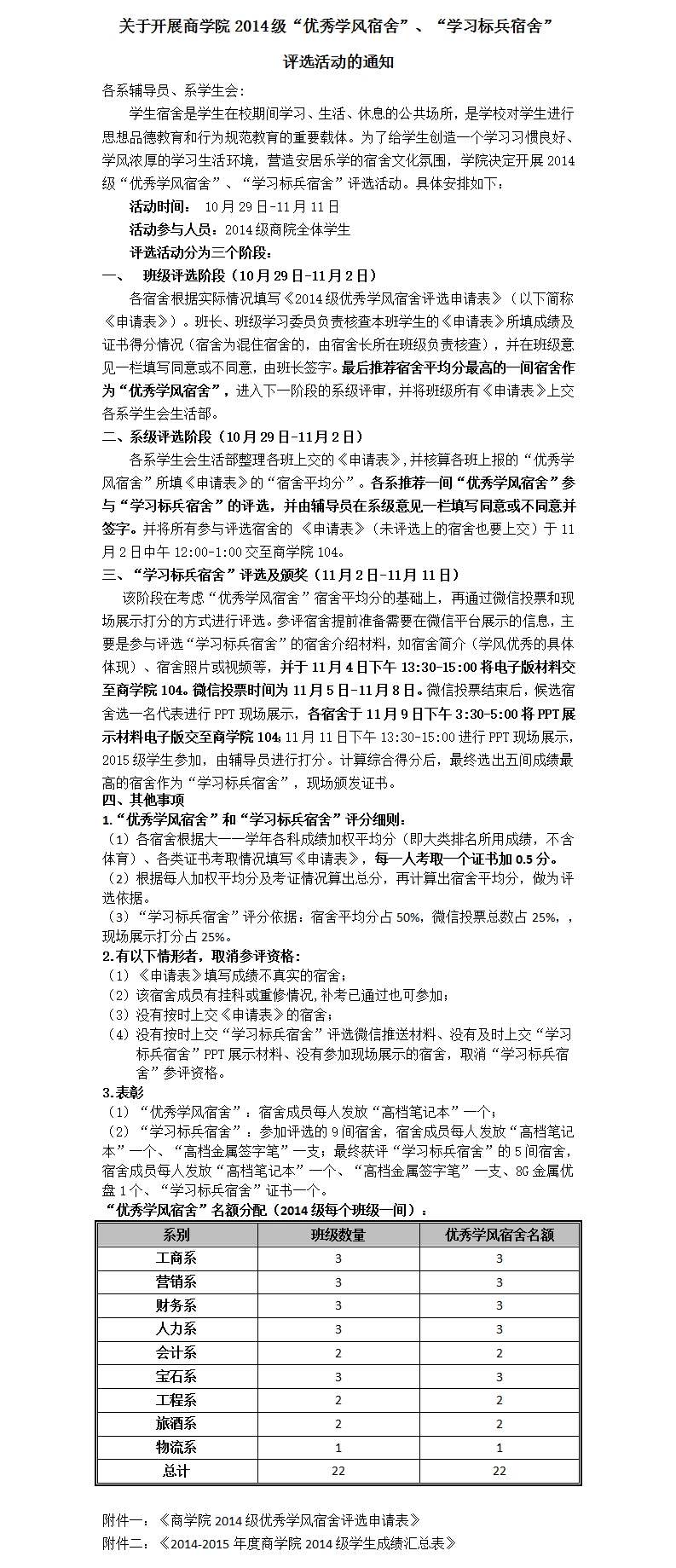 附件一:2014级学风宿舍评选申请表附件二:2014-2015年度商学院2014级学生成绩汇总表
