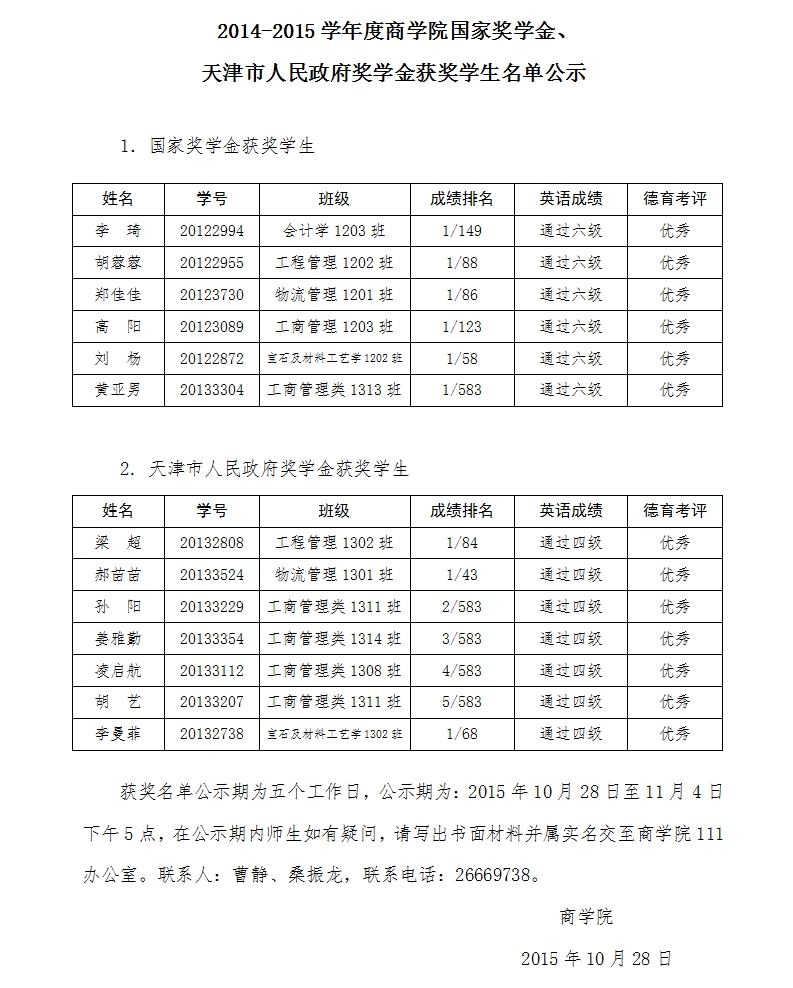 2014-2015学年度商学院国家奖学金、 天津市人民政府奖学金获奖学...