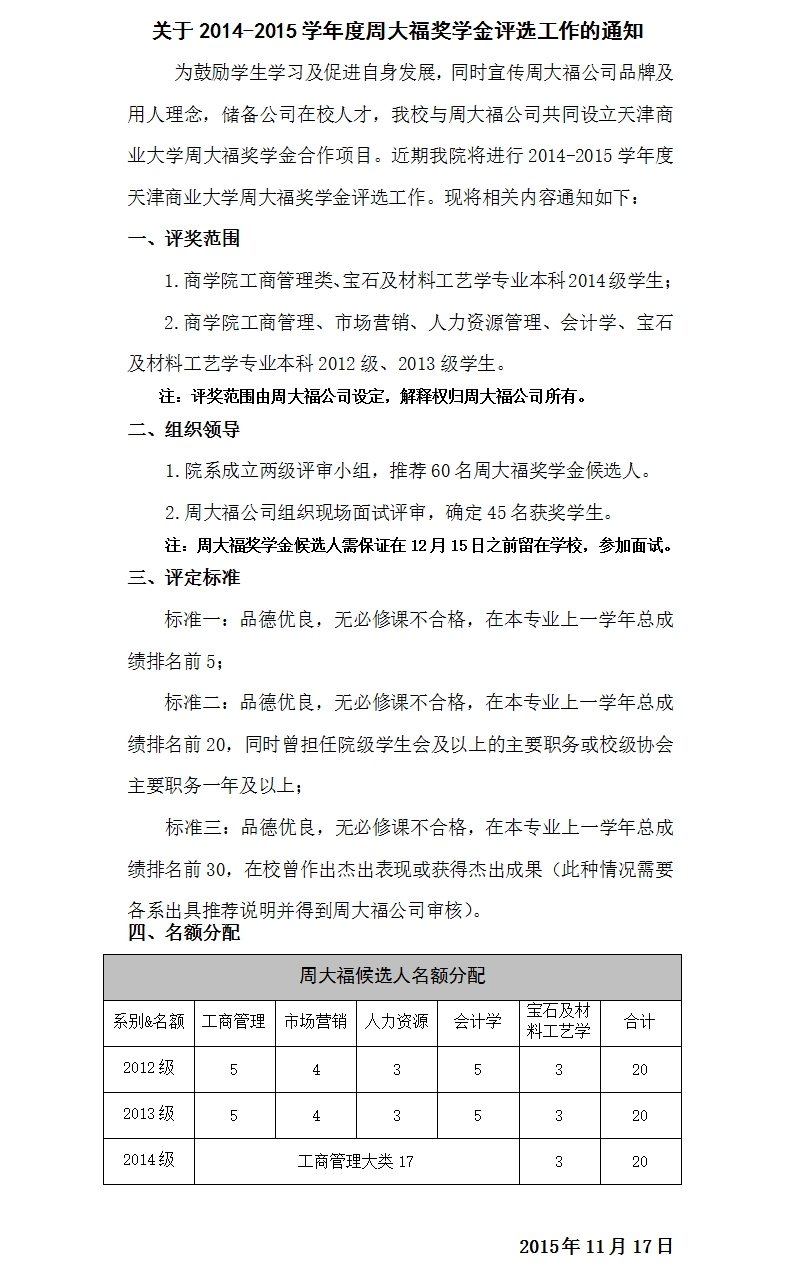 关于2014-2015学年度周大福奖学金评选工作的通知