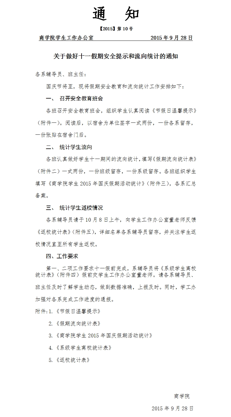 附件一《节假日温馨提示》附件二 《假期流向统计表》附件三《商学院学生2014年十一假期活动统计》附件四《系级学生离校统计表》附件五《返校统计表》
