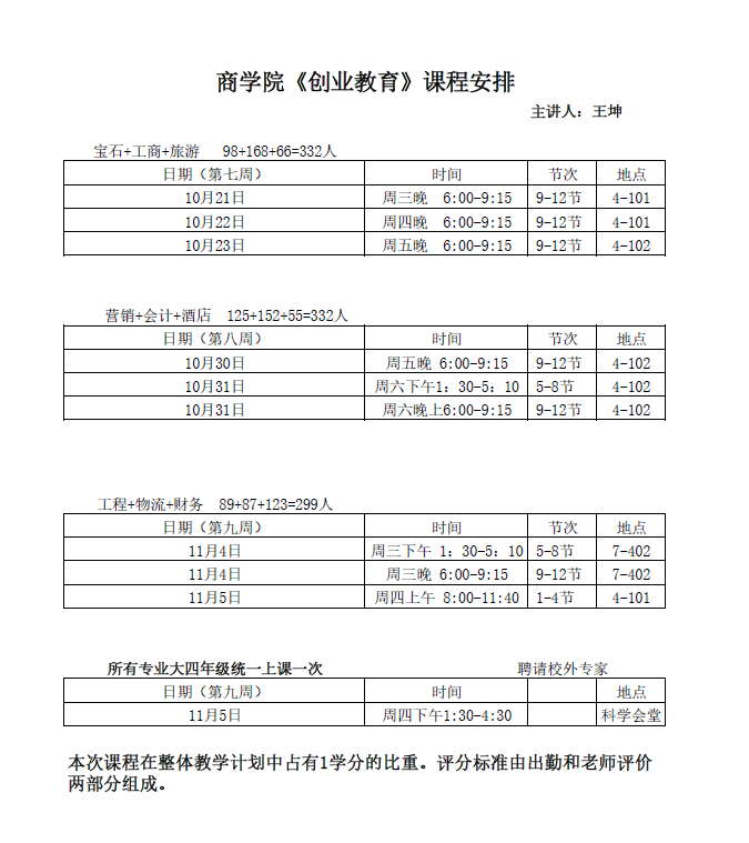 商学院《创业教育》课程安排
