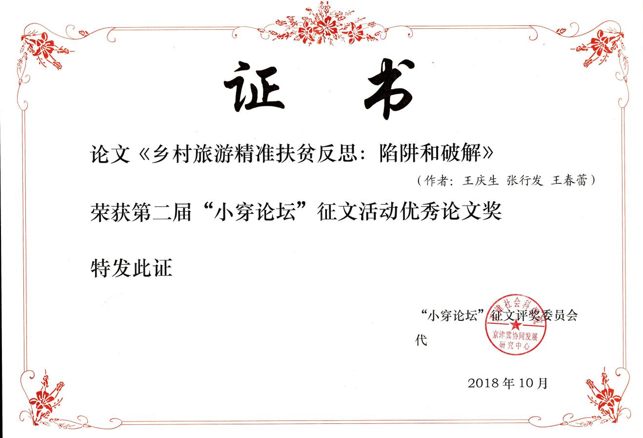 王庆生、张行发、王春蕾合写的论文“乡村旅游精准扶贫反思:陷阱和破解”获得优秀论文奖并收入《论文集》。