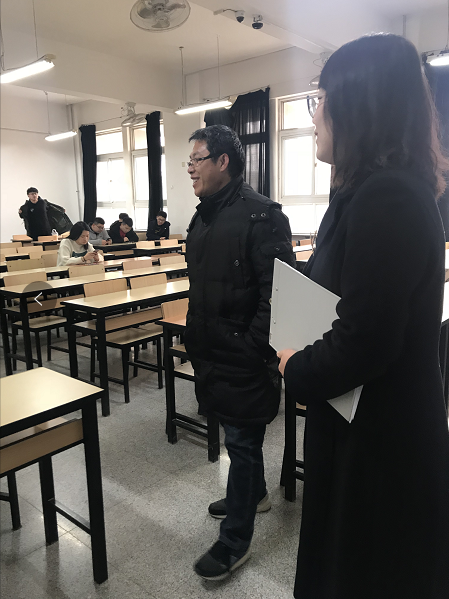 领导白洪文、王樱洁、宗毅,对学院开学第一课的到课及教学运行情况进行全面检查。