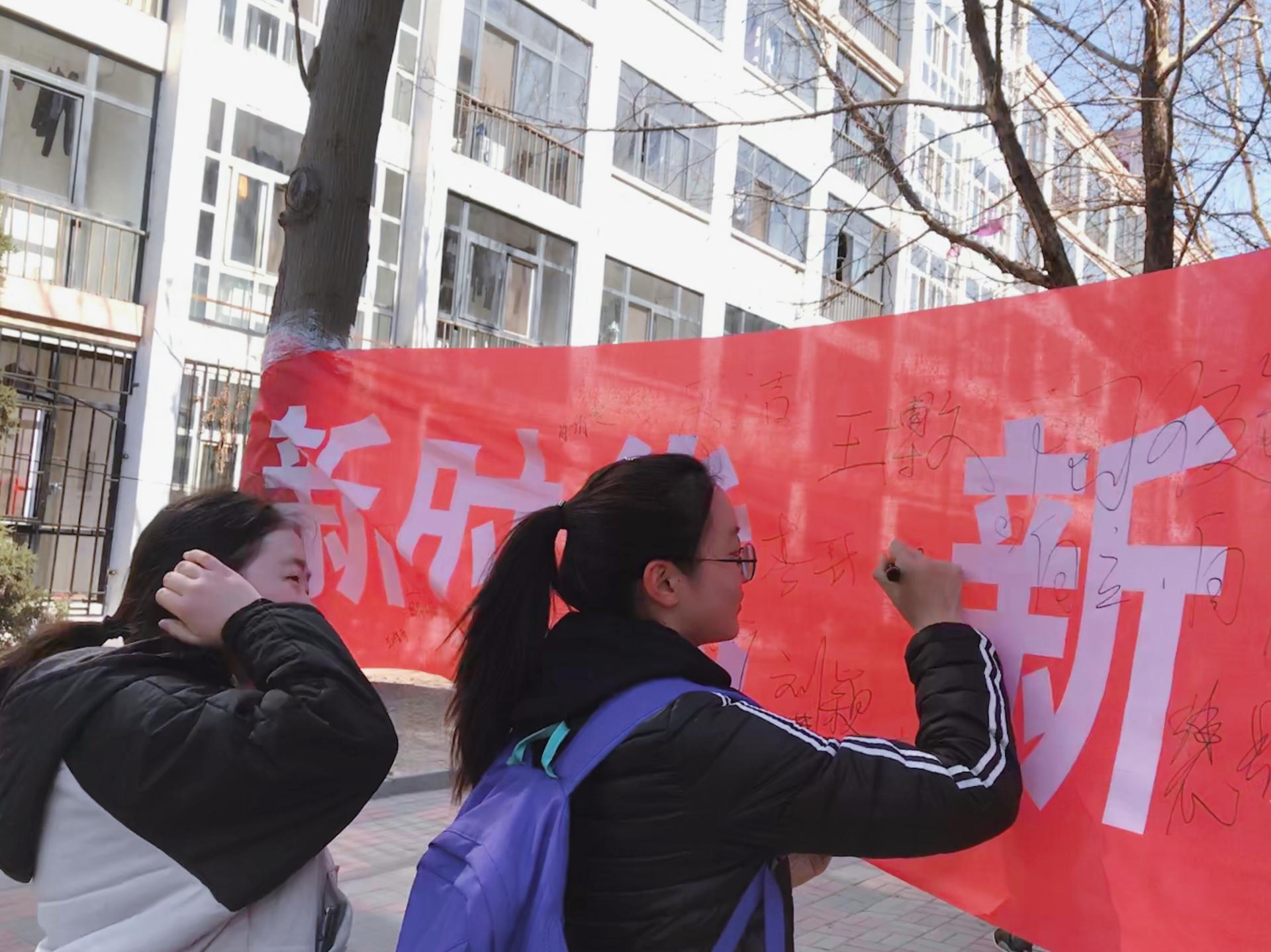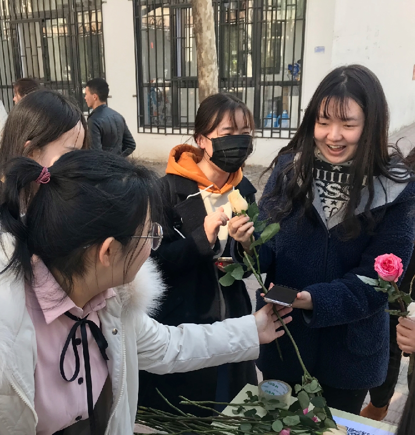 女性师生发放鲜花等礼品,数十名女生在宣传条幅上写下了成长宣言。