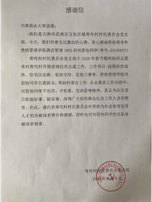 酒店管理专业1802班刘思怡同学主动向所在的天津市武清区青坨村村委会报名,参加村疫情防控志愿服务工作。2月6日至8日,她连续三天在该村疫情防控检查点值班守岗,负责进出该村车辆及人员的登记和向该村村民发放口罩等防护用品工作。在志愿服务工作中,刘思怡同学不怕苦、不怕累,积极工作,受到了该村村民和工作人员的表扬,以实际行动书写了当代大学生的担当和使命。为此,青坨村村民委员会党支部特向学院发来感谢信,对刘思怡同学的辛勤付出和jojo漫画