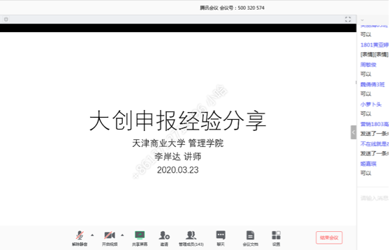 首先,邵艺瑾对申报通知和要求进行了详细解读,并通过屏幕共享为参会同学演示了线上申报系统使用方法。随后,段琪和李岸达针对创新训练和创业训练两种不同类型的项目申报,分别从研究方向的确定、研究方法的选择、团队组建等方面,为同学们详细讲解了申报书的填写以及项目开展过程中可能遇到的问题,帮助大家进一步了解申报注意事项。市级项目负责人16级的高理琨与同学们分享了其申报、调研和结项的体会与感悟,为大家提供了可借鉴的实践经验。