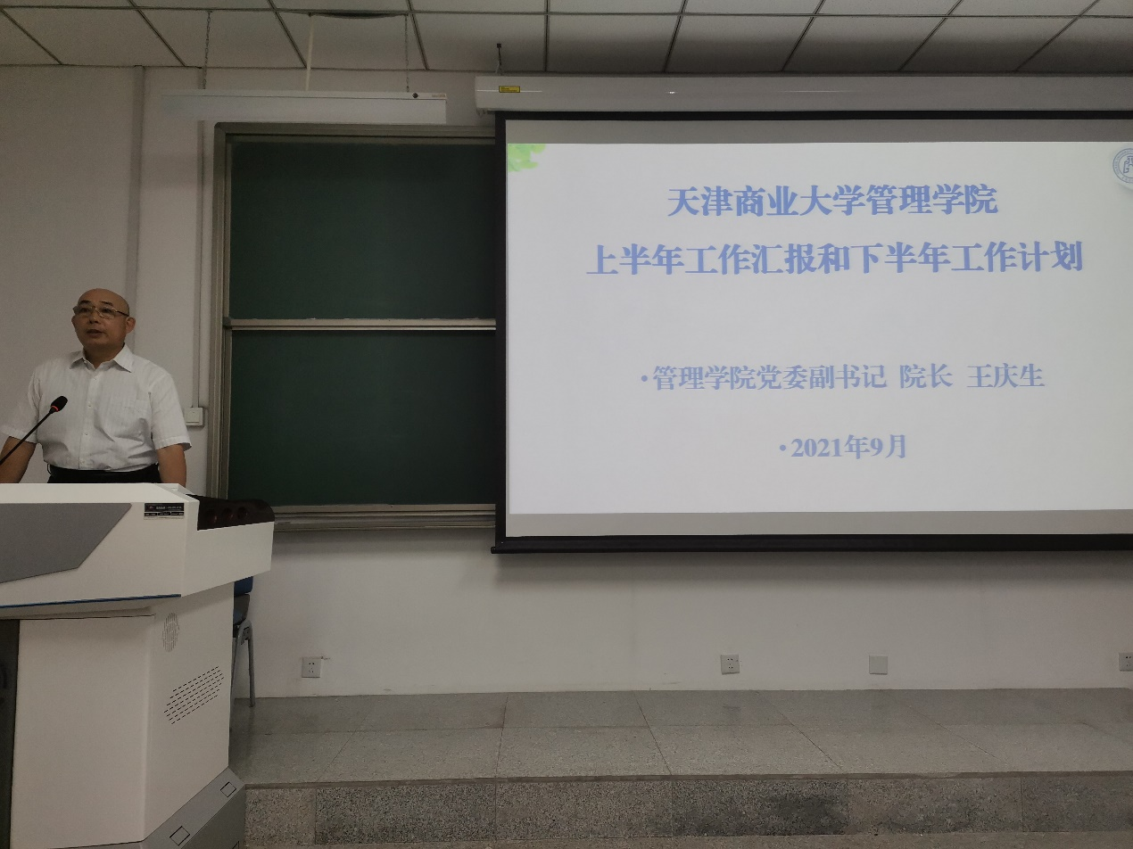 第二届委员会第五次全体(扩大)会议精神。学院党委副书记、院长王庆生代表学院党委、行政,对学院上半年工作进行了汇报,并对下半年工作进行部署安排。各位分管领导根据分工对教学工作、学生工作、研究生工作、学科建设进行了补充说明、安排。